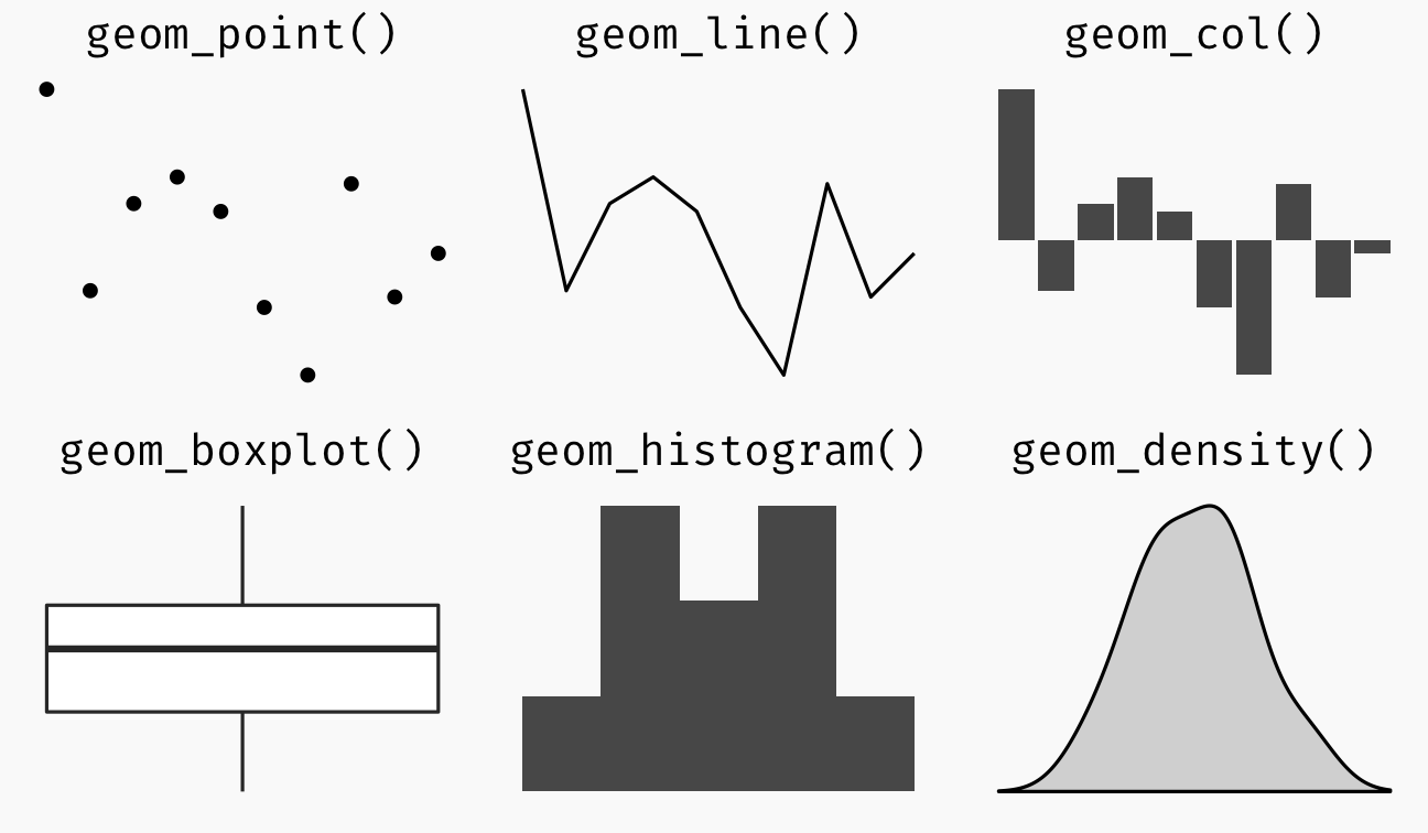 Geometric objects are the actual marks we put on a plot. Examples include: