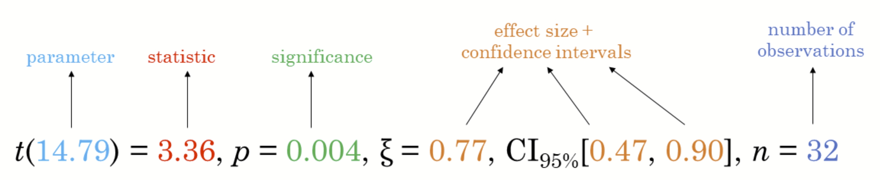 • To follow best practices for statistical reporting. For all statistical tests reported in the plots, the default template abides by the APA gold standard for statistical reporting. For example, here are results from a robust t-test: