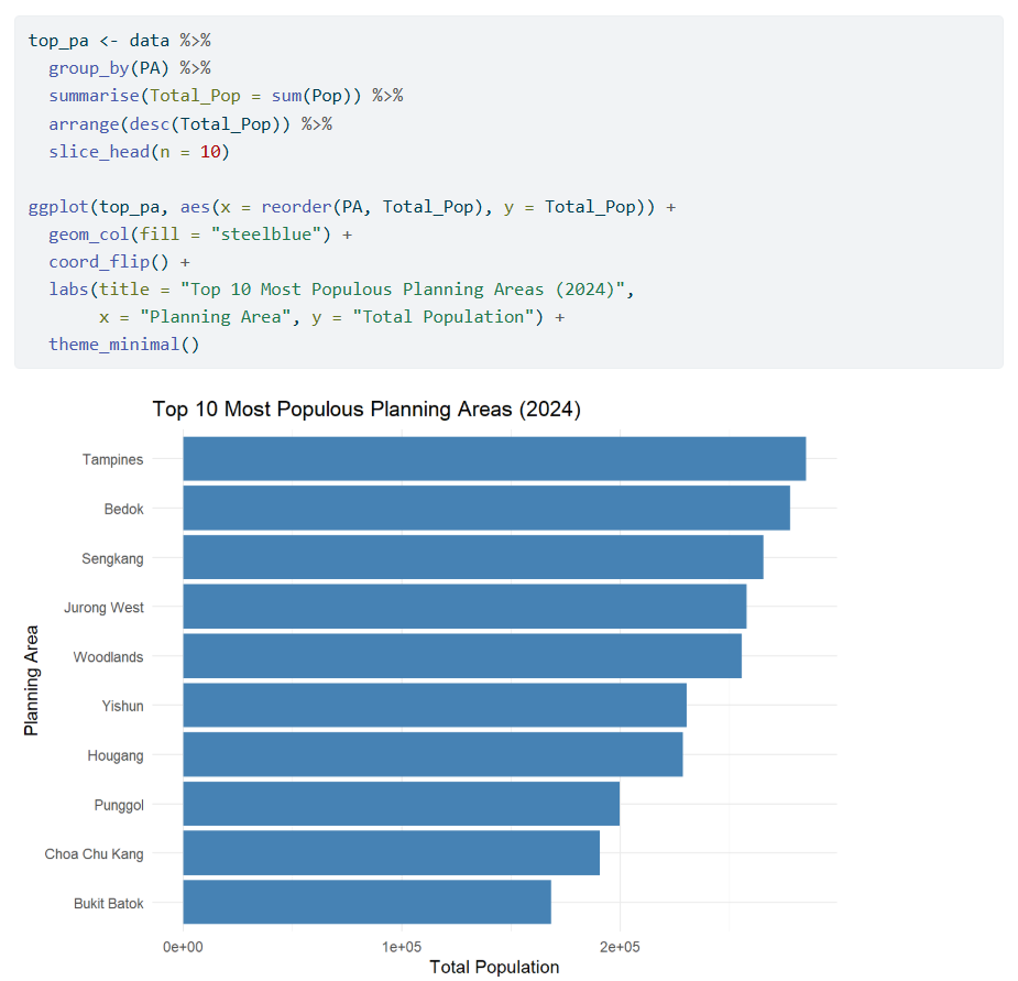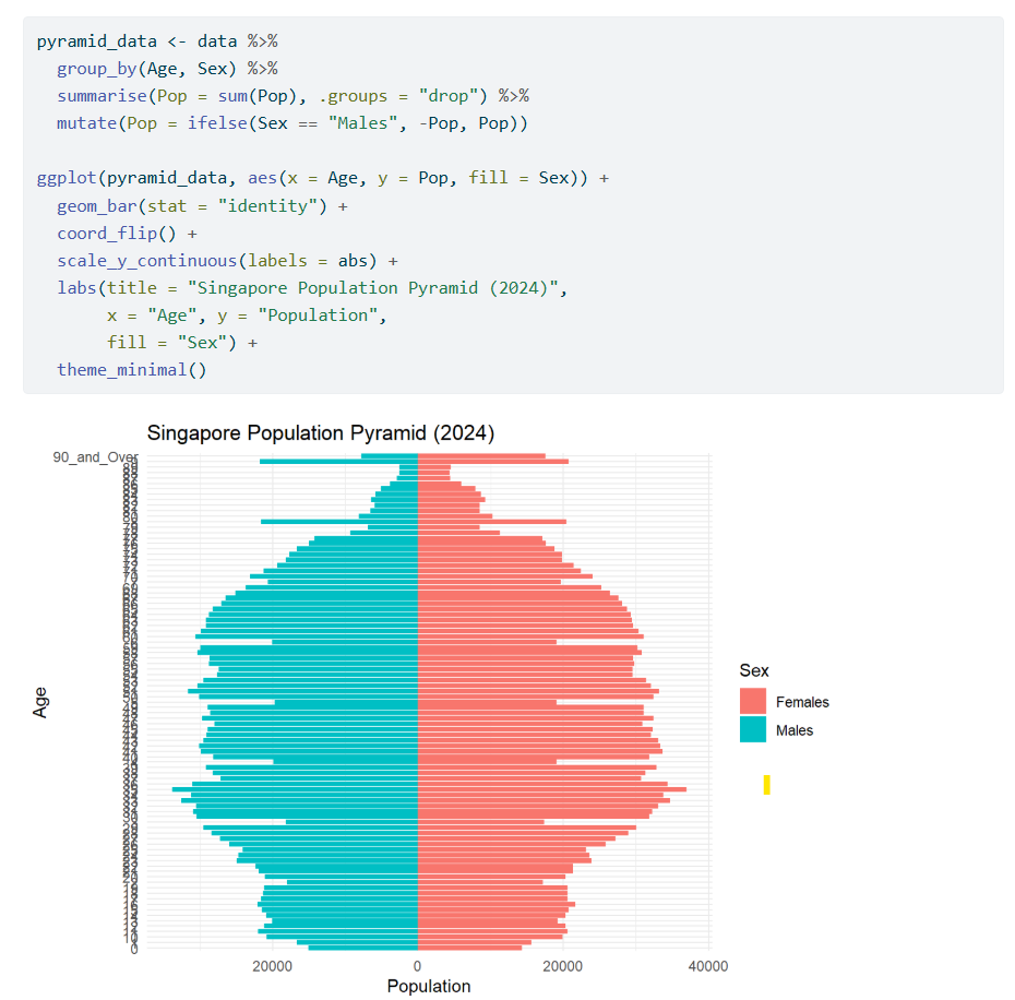 One of the visualisation graphs that I feel can be further improved is the Visualisation 1: Singapore Population Pyramid (2024) graph. The image below shows his codes and the resulting graph output of his code:
