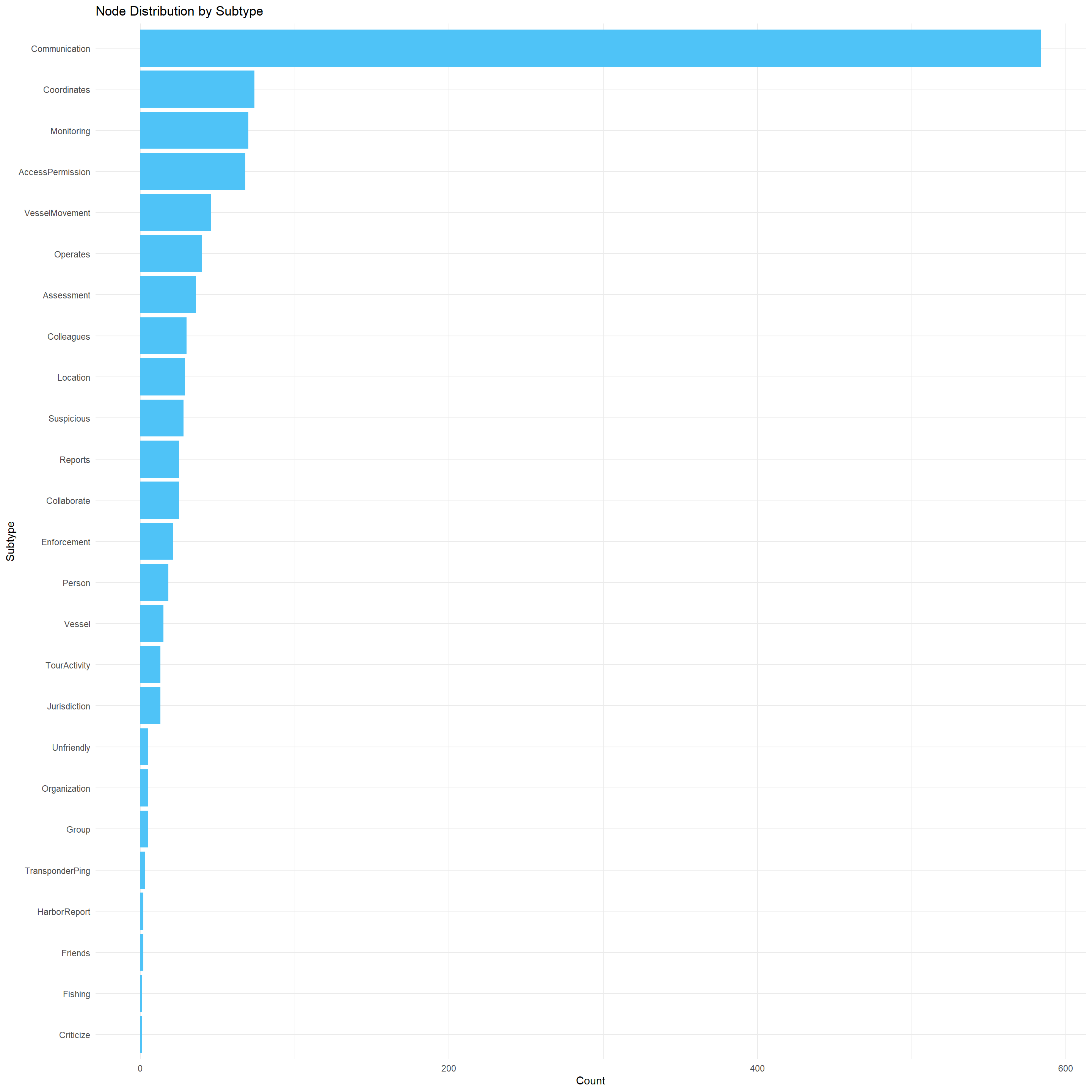 This visualisation is sorted in descending order of frequency. It provides insights into the dominant types of entities or events recorded in the Oceanus knowledge graph.